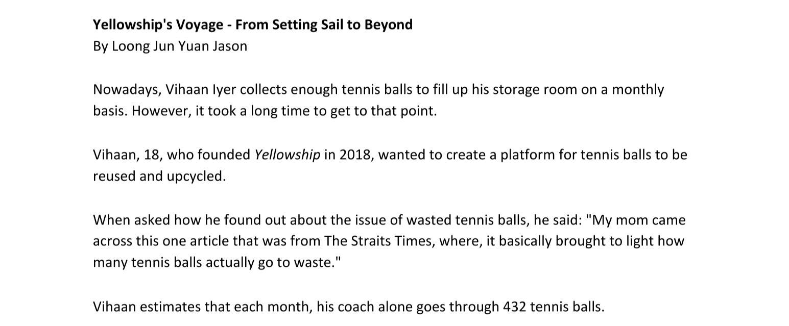 A feature article I wrote about Vihaan Iyer, founder of Yellowship, and his journey to create a platform for the upcycling of tennis balls in Singapore. A large number of tennis balls get wasted every year as they are replaced in professional matches once they lose their bounce.This was written in January 2024 and remains one of my proudest writing works to this day.