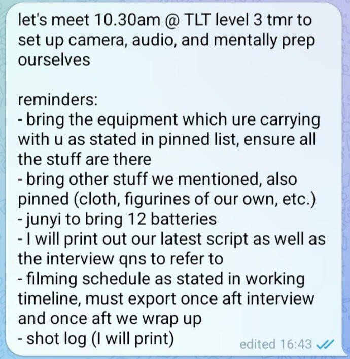 These proved to keep the team on track and on the same page and is still something I actively do in my current production projects, be it regarding an approaching milestone / deadline or just anything related to production matters itself.With closer attention to the photo on the right, our group borrowed a spare camera and tripod from another group in the class that was not shooting that day, and I wanted to make sure we took full accountability and responsibility of that.