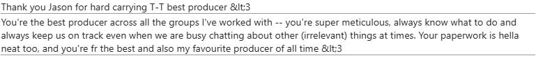 Our school requires us to give feedback to each other at the end of every project. Here's some I've received from my peers that have worked with me for production!
