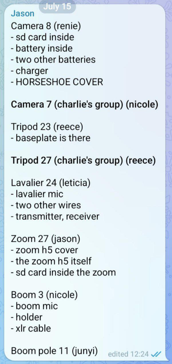 These proved to keep the team on track and on the same page and is still something I actively do in my current production projects, be it regarding an approaching milestone / deadline or just anything related to production matters itself.With closer attention to the photo on the right, our group borrowed a spare camera and tripod from another group in the class that was not shooting that day, and I wanted to make sure we took full accountability and responsibility of that.
