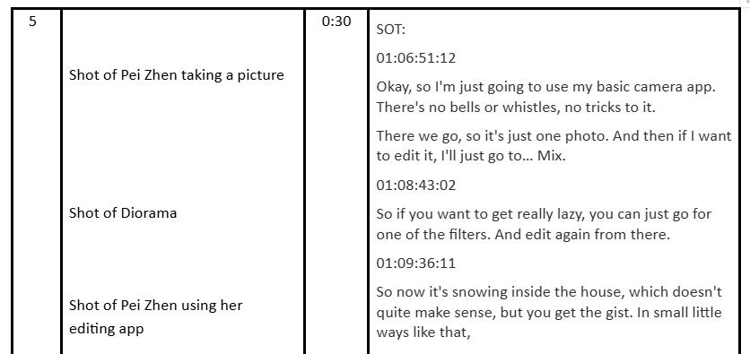 Each of my group members first had to find profiles for a documentary story individually, then we came together as a group to select the best proposal based on realistic constraints of story, access and what we could film. My co-producer Reece's story about a lecturer who still keeps up with her passion for toy photographer was selected. Reece was the main contact person with our profile throughout.Due to some initial miscommunication regarding access, we ended up simulating the environment of a house in one of the classrooms in our school. We chose the final classroom seen in the video after scouting through many classrooms. And I was the person in charge of contacting one of the school's managers regarding booking of the classroom to be used for filming purposes.Admittedly, this was a space we had to create, but our profile did have a collection of her figurines in school, in the office. As students, we are not allowed to film inside for obvious reasons, so this was the best we could do with what we had, as we ultimately agreed changing to a different story idea from our other group members was no longer possible given the time constraint.