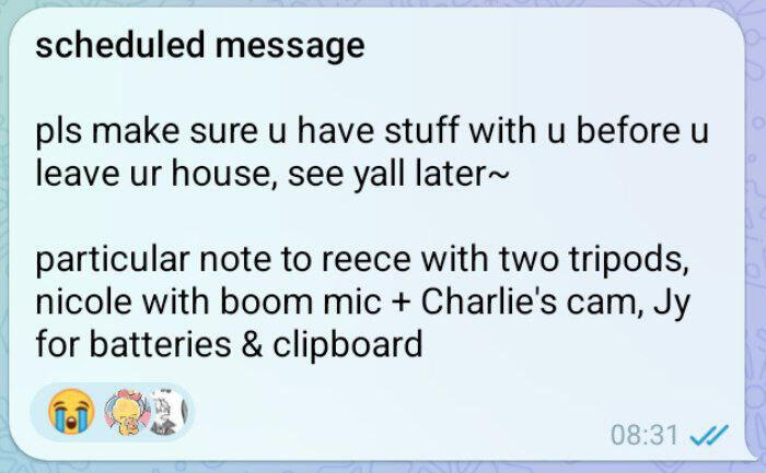 A core aspect of working with me in production which has been around since the very start: frequent messages of checking in and reminders! - especially before shoot days or when we had to return our equipment after the loan period was over.