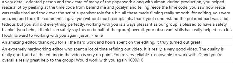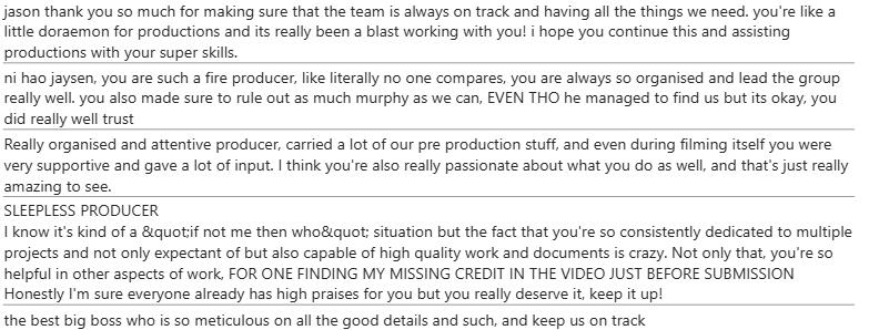 Our school requires us to give feedback to each other at the end of every project. Here's some I've received from my peers that have worked with me for production!